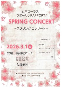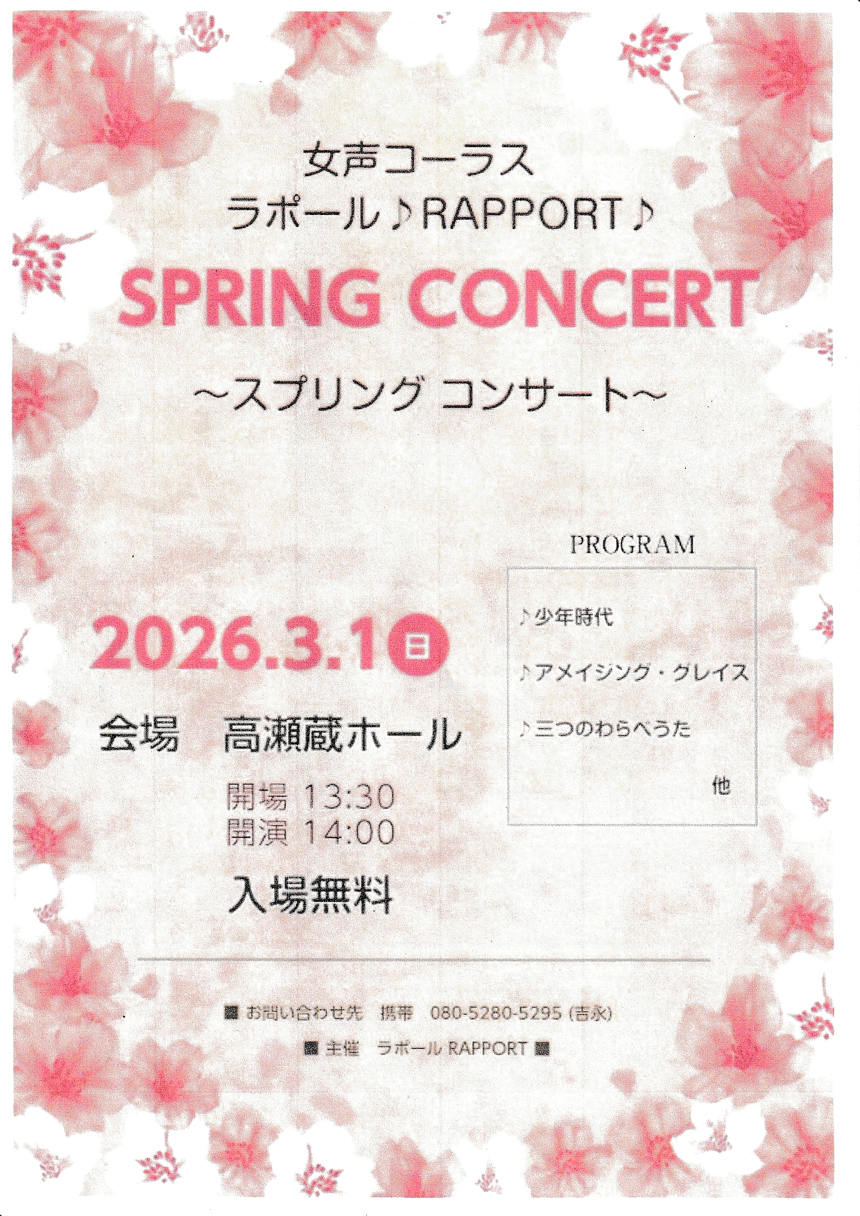 ラポール スプリングコンサート 女声コーラスで、皆様ご存知の懐かしい歌や、親しみのある歌をお届けします。 どうぞお気軽にお越しください。 ≪曲目≫ 少年時代 アメイジング・グレイス 三つのわらべうた 他 日程 令和8年3月1日(日) 開場 13:30 開演 14:00 主催者 ラポール 問合せ先 080-5280-5295 入場料 無料